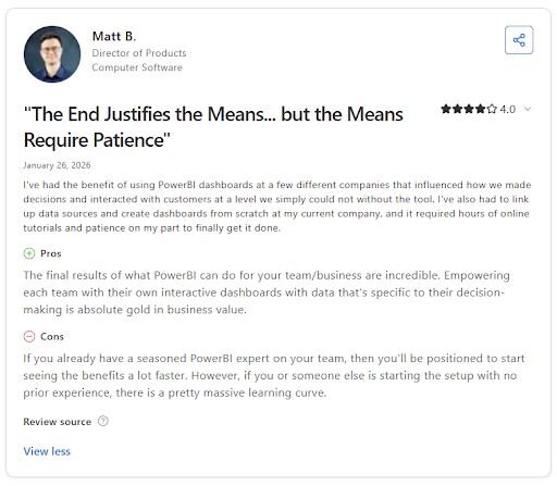 Con: “If you already have a seasoned [Power BI] expert on your team, then you’ll be positioned to start seeing the benefits a lot faster. However, if you or someone else is starting the setup with no prior experience, there is a pretty massive learning curve.” - Matt B., Capterra