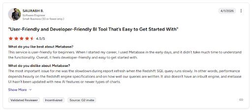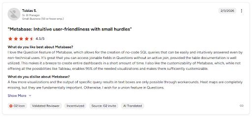 Self-hosted deployment: Open-source version available for teams that want to run Metabase on their own infrastructure.