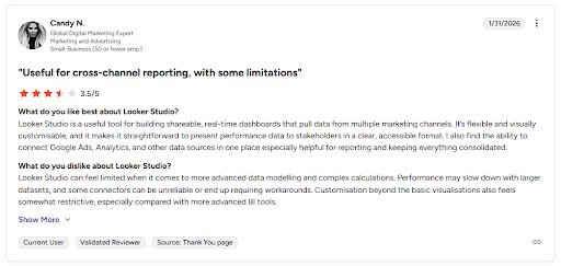 Native connections to Google’s data ecosystem work with minimal setup | Non-technical users may find the initial data source setup harder than guided BI tools |