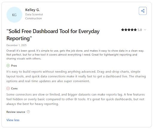 Con: “I wish it were possible to copy and paste elements like text boxes, and I think the user experience could be improved to make creating simple, attractive dashboards easier. … Overall, I feel there should be more AI-powered features included.” - Anirban G., G2