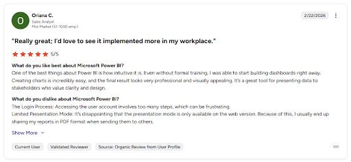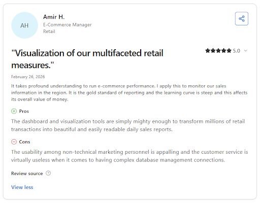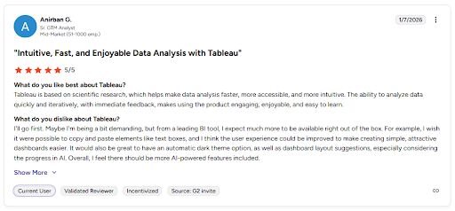 Con: βI wish it were possible to copy and paste elements like text boxes, and I think the user experience could be improved to make creating simple, attractive dashboards easier. β¦ Overall, I feel there should be more AI-powered features included.β - Anirban G., G2