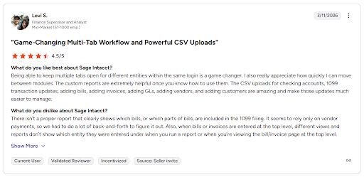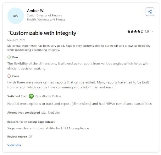 What it does: Sage Intacct is a cloud-based financial management platform that handles accounting, reporting, and multi-entity consolidation for growing businesses.