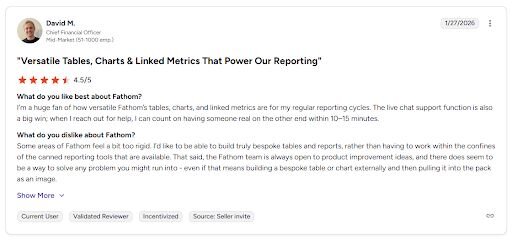 Fathom and Cube are strong picks for finance teams that need forecasting and planning built into their workflow. Power BI and Tableau work well for teams that need polished dashboards and have the technical capacity to build them. Excel remains a reliable fallback for flexible, one-off financial modeling.